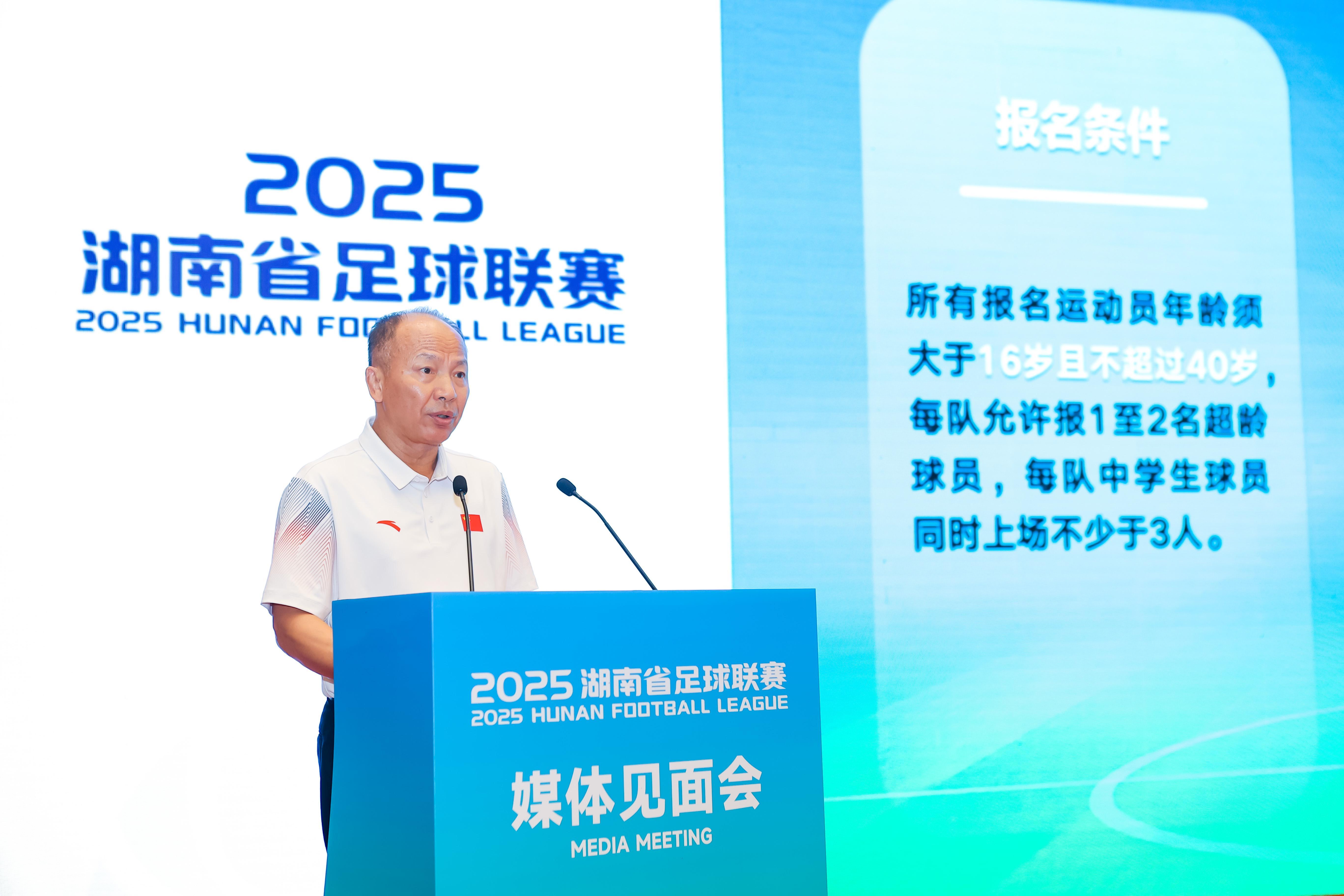 湖南省足球协会主席罗器宇在媒体见面会上介绍“湘超”联赛竞赛工作情况。