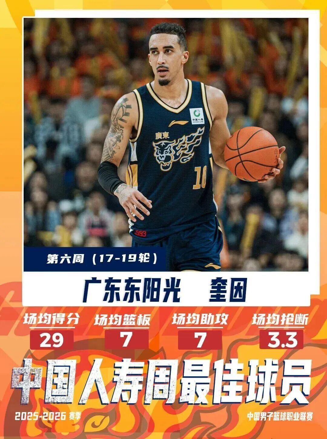 1月26日,CBA联赛官宣了2025-26赛季常规赛第六周的周最佳球员获得者,因为Queen这个姓氏而有着“皇后”外号的广东男篮外援奎因获得该奖项。