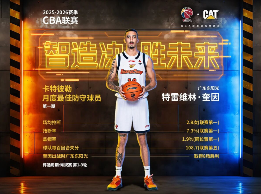 在2025-26赛季CBA第一期月最佳防守球员评选中,奎因凭借出众的防守数据当选,彼时他 场均送出2.9次抢断,抢 断率高达7.3%,两项数据均领跑全联盟,1.9%的盖帽率亦位居同位置球员榜首。